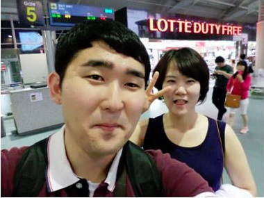 여긴 김해공항이에요. 면세점이 좀 많이 작긴 했지만... 면세점 간판이 나와야 한다며~이렇게 찍은 사진이에요. 저흰 촌놈들 ^^
