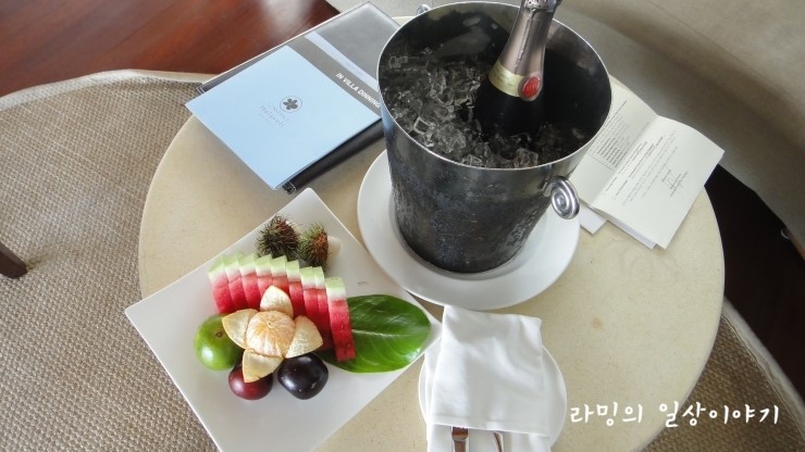 허니문 예약 특전으로 샴페인과 과일 서비스