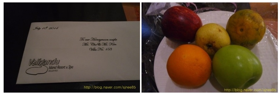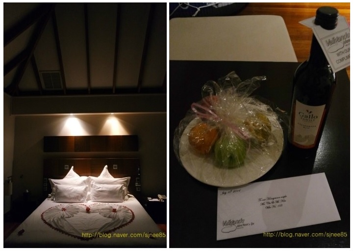 허니문으로 룸을 예약한거라 저녁먹고 와보니 편지, 와인, 과일에 침대 장식까지 예쁘게 꾸며놔있었다.