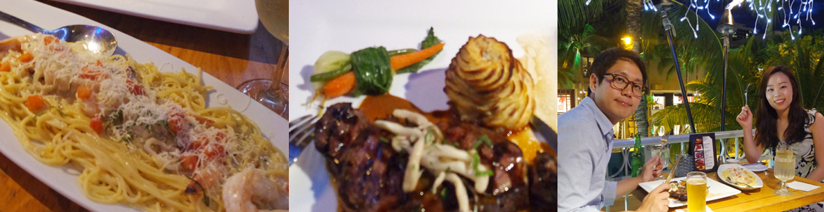 마지막 날이라 분위기 있게 먹자며 스테이크과 새우 파스타!! 그리고 화이트 와인을 주문하였다.
