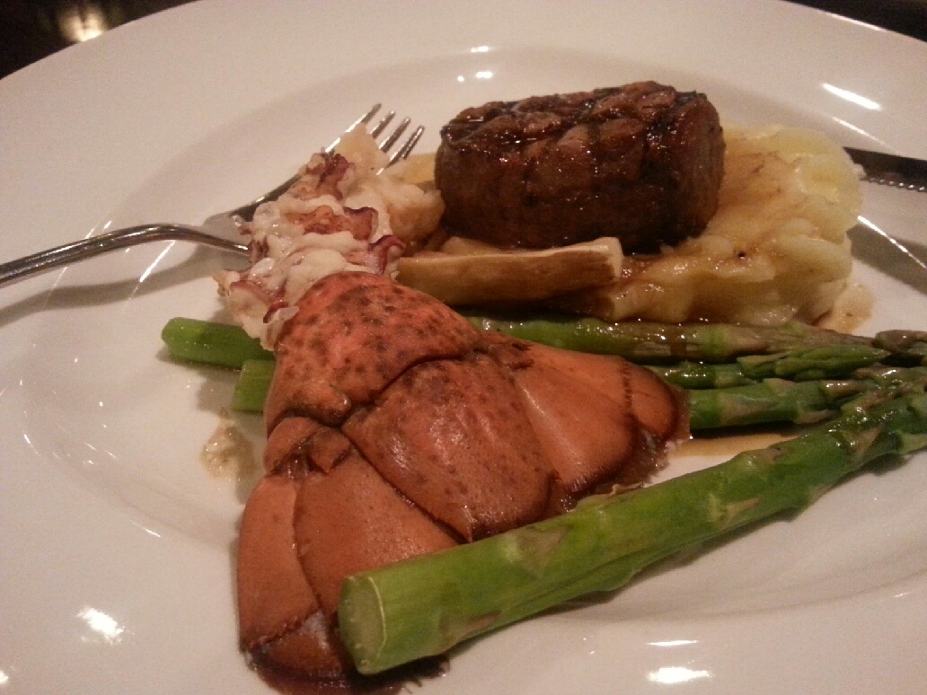으깬 감자위에 스테이크, 랍스타, 아스파라거스.