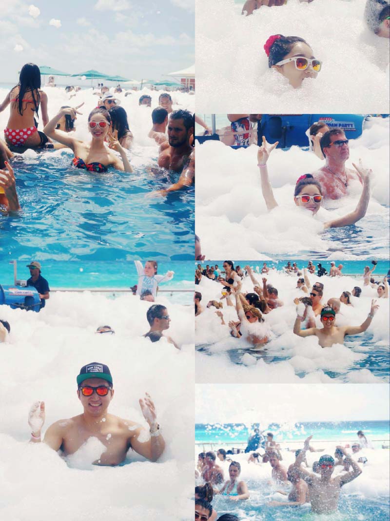 수영장 가득 거품기계가 계속 버블을 쏴줬어요!