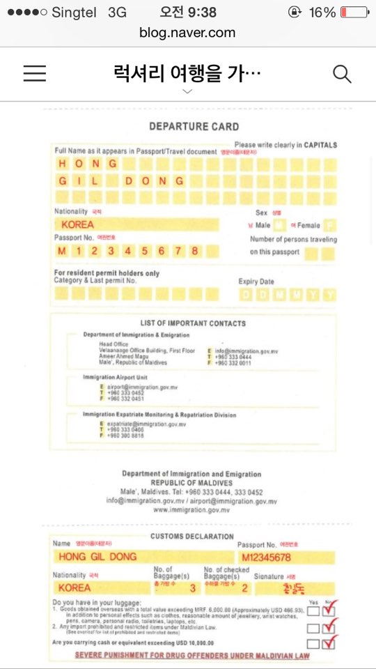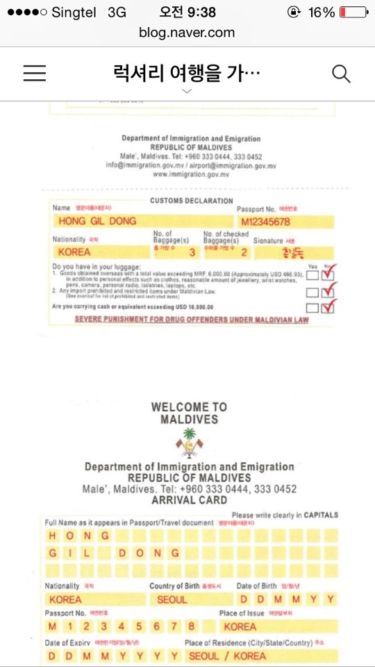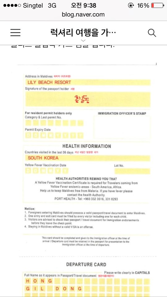그리고 다시 이제 창이공항에서 말레공항으로 떠나려는 찰나.. 영어를 못하는 저희들에게 또 한번의 큰 시련이 찾아옵니다.. 바로 입국 출국심사서(?) 같은.. 걸 적어야 하는... (저희는 게이트 열리자마자 로밍해가지고 가져간 휴대폰으로.. 열심히 찾아서 적었네요...) 저처럼 영어를 못하시는 분들은 당황하실수 있으니, 예시 같은걸 뽑아가지고 가시는게 좋을듯 싶습니다.
