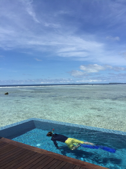 침대에서 눈뜨면 바로 문열고 데크로 나가 수영을 즐겼어요.