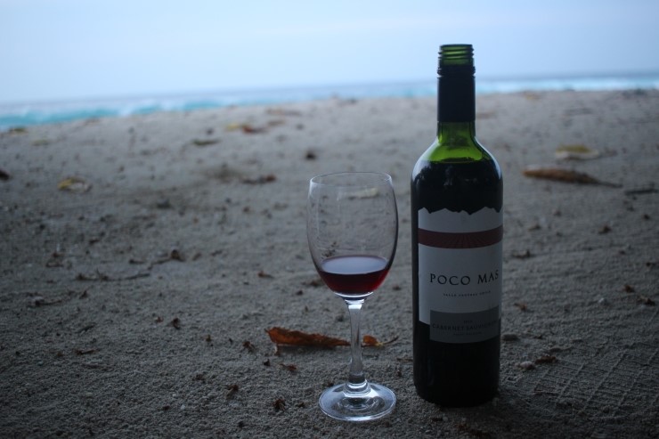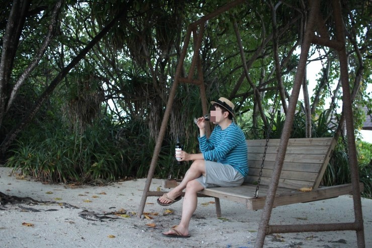 방에 구비되어있는 와인 하나 꺼내들고 휘적휘적 바닷가 그네로 갑니다.