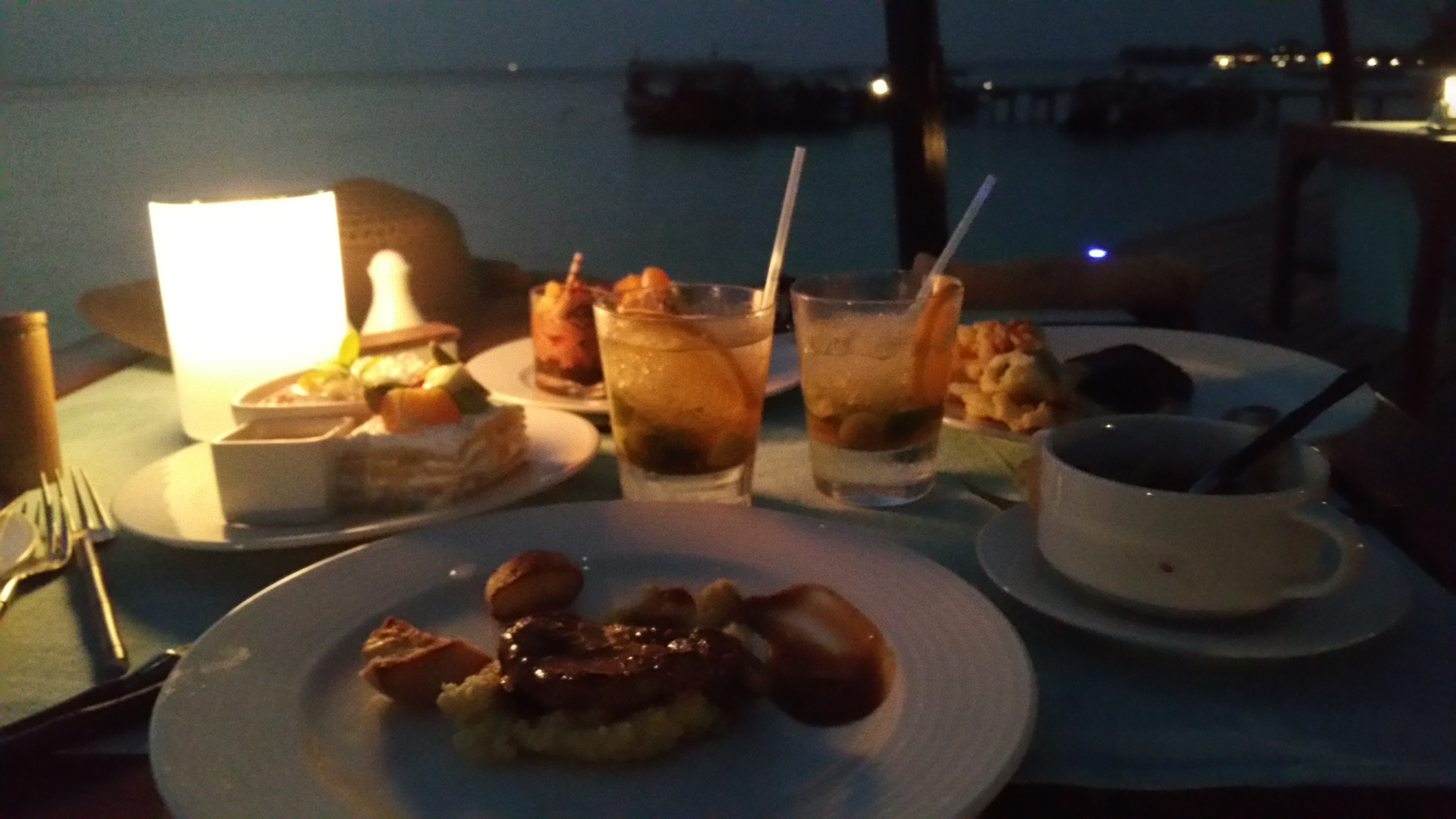 이렇게 물놀이를 하고, 들어와서 낮잠 한 판 자고~ 저녁을 먹으로 갔습니다~ 저녁도 완전 대박!!! 즉석에서 만들어 주는 요리가 두세가 정도 매일 있습니다. 근데 즉석요리 스테이크는 정말정말 맛있습니다. 스테이크 밑에 깔려있는 버터가 섞인 스크램들 같은게 깔려있는데, 그것도 맛있고, 스테이크도 맛있고, 생선 스테이크같은 것도 정말 맛있어요~~ 그리고, 드뎌 모히또에서 몰디브 한잔을 했습니다. 10달러 정도 였던것 같아요~ 근데 모히또, 진짜 맛있습니다~