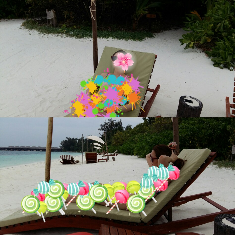그리고 아래 사진 배경을 보면 비치의자가 보이시죠? 이 비치의자가 모두 이 라인의 아일랜드빌라 사람들이 사용하는 해변이에요~ 여기서 책 읽고 칵테일 한 잔 하고, 이야기 하는 커플들이 많더라구요~~ 해빛이 완전 강렬해서 쫌만 있어도 금방 타더라구요. 물론 선크림 듬뿍 발랐는데도요~