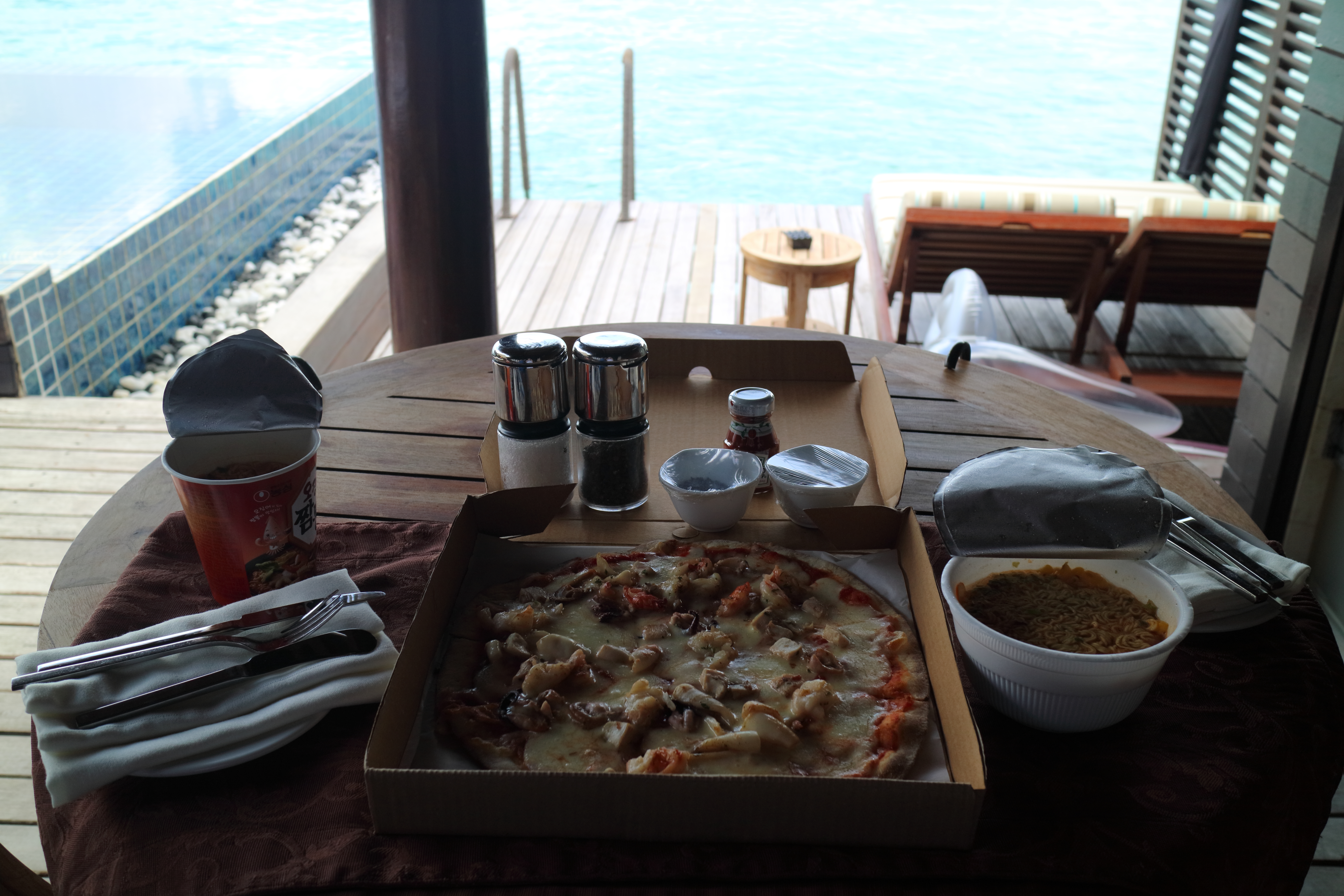배가 고파서 가지고 온 컵라면과 룸서비스를 시켜 예쁜 바다를 보며 먹었어요 ㅋㅋㅋㅋㅋㅋㅋㅋㅋㅋㅋㅋㅋㅋㅋㅋㅋㅋㅋㅋㅋㅋㅋㅋ 저 피자 그냥 전화로 씨푸드 피자 플리즈~ 하니까 왔어요 ㅋㅋㅋㅋ 근데 진짜 맛있었네요