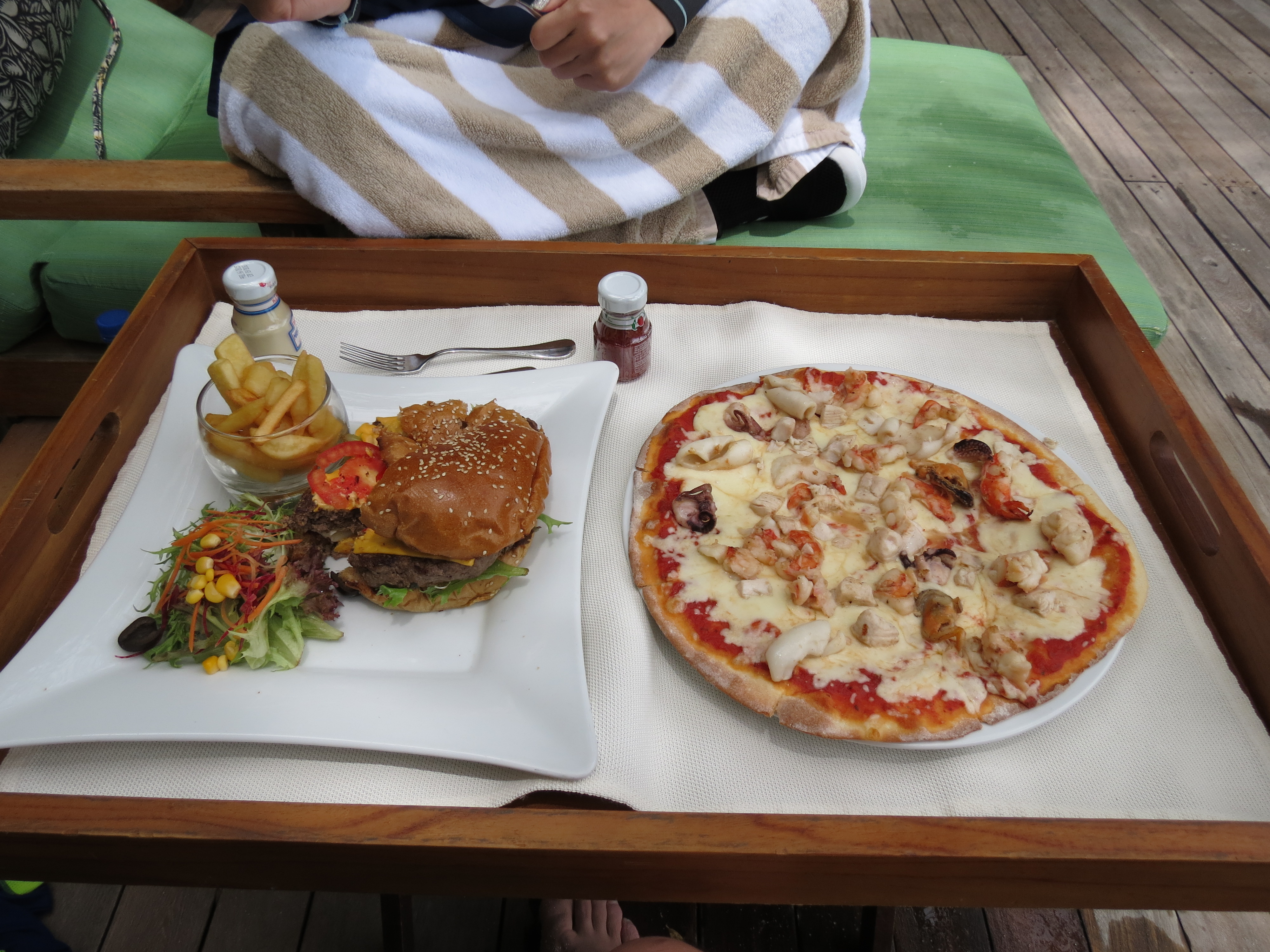 물놀이 후 유명하다는 타지버거를 시켜봤어요 ㅋㅋㅋㅋ 피자는 늘 먹는 씨푸드피자로~