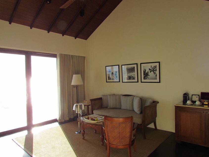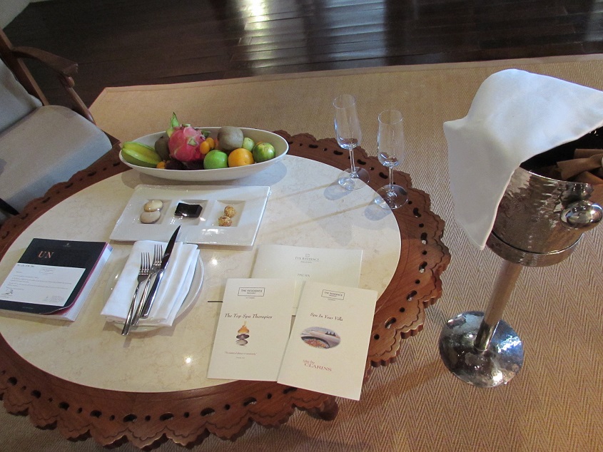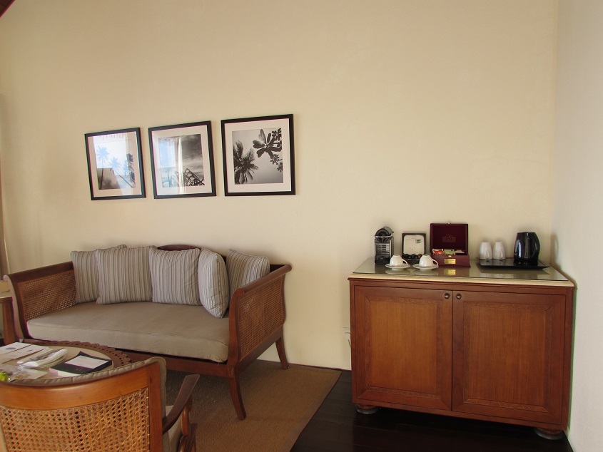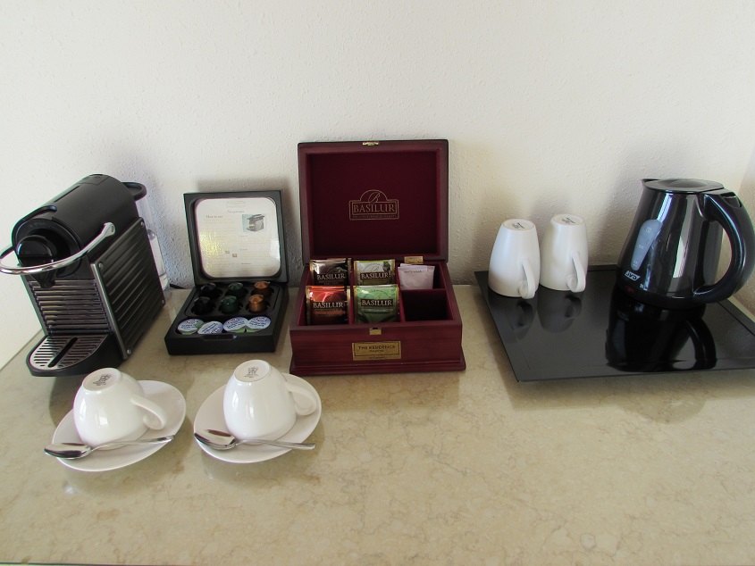 제가 1편에서 썬셋을 담았던 샴페인 잔과 웰컴 과일도 보입니다 네스프레소 머신과 맛있는 티도 보이구요~