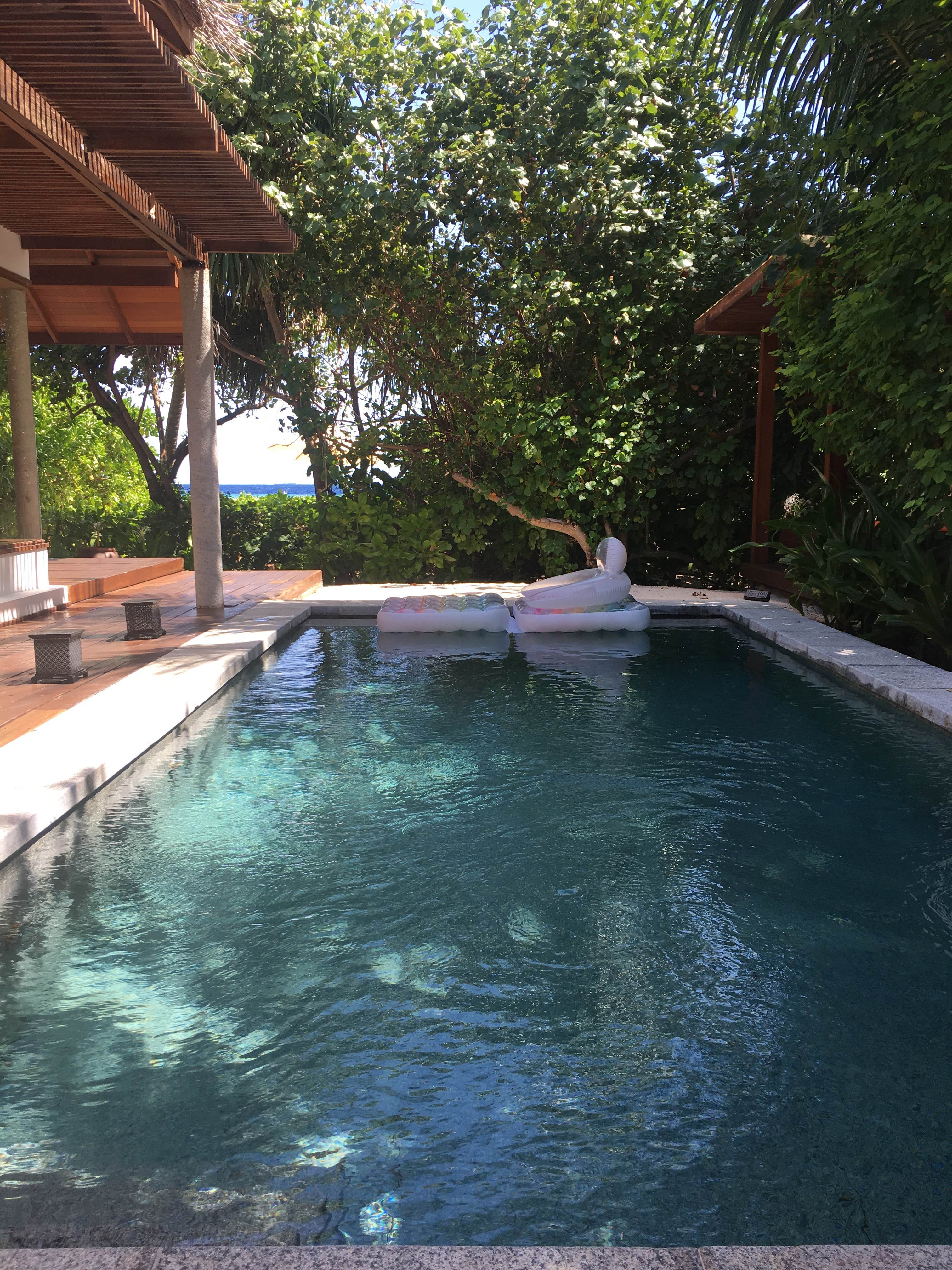 비치빌라안에 마련된 개인 풀장사진입니다, 와이프가 따로 가져온 이쁜 튜브를 셋팅하니 더욱더 빛나보입니다.