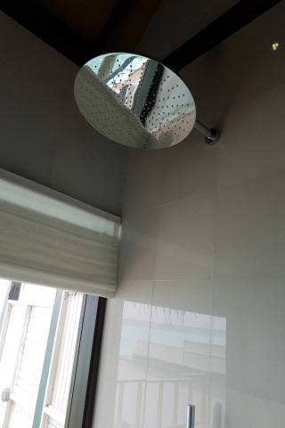 방 크기는 침실, 화장실 거의 반반 정도 됩니다. 비슷한 크기예요. 욕조에서 바로 테라스 데크로 나갈 수 있습니다.