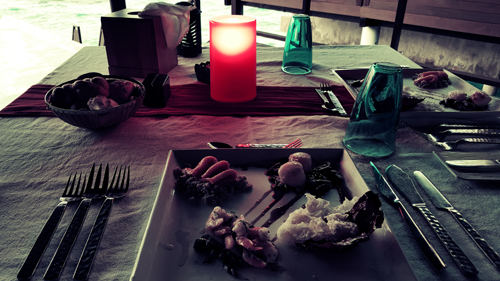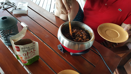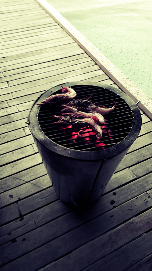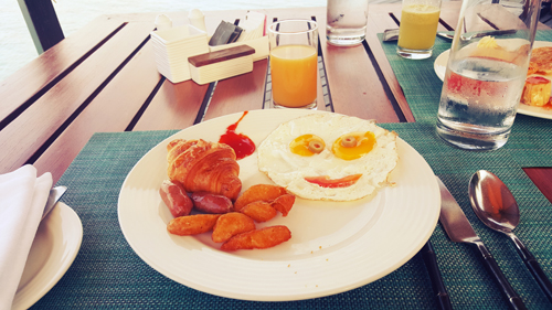 테라스 문을 열면 보이는 수영장^^ 코코팜보두히티 워터빌라는 개별수영장이 다 있는데요. 전 정말 유용히 썼어요. 스노쿨링장비 착용연습도 하고요. 바닷물에 젖은 몸도 씻고 ㅋㅋ 햇볕도 잘 들어서 래쉬가드가 금방 말라요~ 저희 워터빌라 입구입니다.^^ 몰디브에서 모자쓰고 찍은 유일한 사진이에요. 이 사진 찍고 모자는 바다로 휙.....그날 따라 바람이;; 모자 조심요 ^^; 워터빌라 입구에는 얘네 작은 상어가 있어요..지금 사진상에선 잘 안보이는데 작은 물고기떼가 여길 돌아다니거든요. 그래서 지키고 있는건지 항상 있어요 ㅋㅋ 그리고 또 하나의 붙박이,, 새입니다.^^ 실제로 보면 참 큽니다. 이 새도 거의 해변가에 있어요. 워터빌라를 나와 레스토랑으로 향하는 숲길 메인수영장입니다. 거의 이용객이 없어 한산한데요. 저희가 이용할 때는 마침 중국인 몇 명이 있어서 전세낸 느낌은 안들더라구요ㅋ 중국인 많냐구요? 생각보다 한국인, 중국인 별로 없다고 생각했는데 안 마주쳤을 뿐이지 많이 묵는 것 같더라구요. 그치만 식당 이용할 때 본거지 거의 볼일 없었어요. 둘만의 시간 충분히 보낼 수 있어요^^ 바다로 이어진 것 같은 수영장 끝은 발은 안 닿았지만 뷰가 정말 좋았습니다.^^ 수영하다 지치면 베드에 누워 음료 시켜먹었구요. 코코넛들어간 음료였는데, 음료맛은 좀 독특한 것 같은.. 옵션 중에 인빌라bbq 선택해서 먹었습니다. 언제 이런거 먹어보냐며ㅋ 직원 두명이 와서 직접 랍스타,해물,고기 등등 구워주는데요. 저녁노을 보며 분위기도 끝내주고, 맛도 끝내줬어요!! 근데 양이 너무 많아서 둘이 먹기엔 아깝더라구요...가격도 비싸요ㅠㅠ 돈아껴 해상스포츠나 다른 옵션 하는 게 나을 것 같아요. 저흰 HB라서 점심에는 이렇게 라면이나 햇반을 먹었어요. 저 작은 전기냄비가 참 유용했답니다. 아침 조식 뷔페사진입니다. 계란후라이 귀엽죠?^^ 음식사진 꽤 찍은 거 같은데,, 다 어디로 갔는지.. 몰디브 음식 짜다고 해서 걱정 많이 했는데요. 오믈렛, 스크램블, 생과일 바로 갈아주고 암튼 다다다 맛있었어요^^ (참고로 음료는 조식 때만 공짜예요) 직원들도 정말 갈 때마다 반갑게 인사해주고 말 걸어줍니다. 조식도 맛있지만 허니문특전이었던 스타레스토랑 디너는 더 맛있어요.