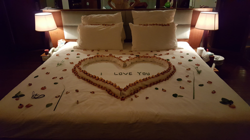 몰디브 마지막 밤. 신랑이 하우스키퍼의 도움을 받아 준비한 침대프로포즈 사진입니다♡