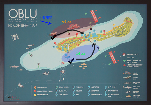 파란색 화살표 방향이 파도의 방향입니다. 지도에서 노란색의 C가 라군 빌라인데,
