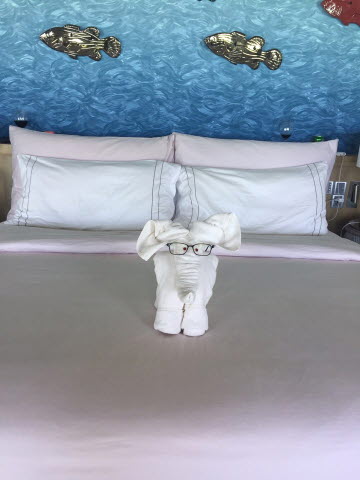 빌라별로 담당 직원이 배정되는데 저희 청소해준분은 혼신의 힘을 다하여 매일 다른 모양의 수건접기를 해주었습니다.