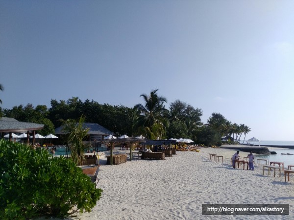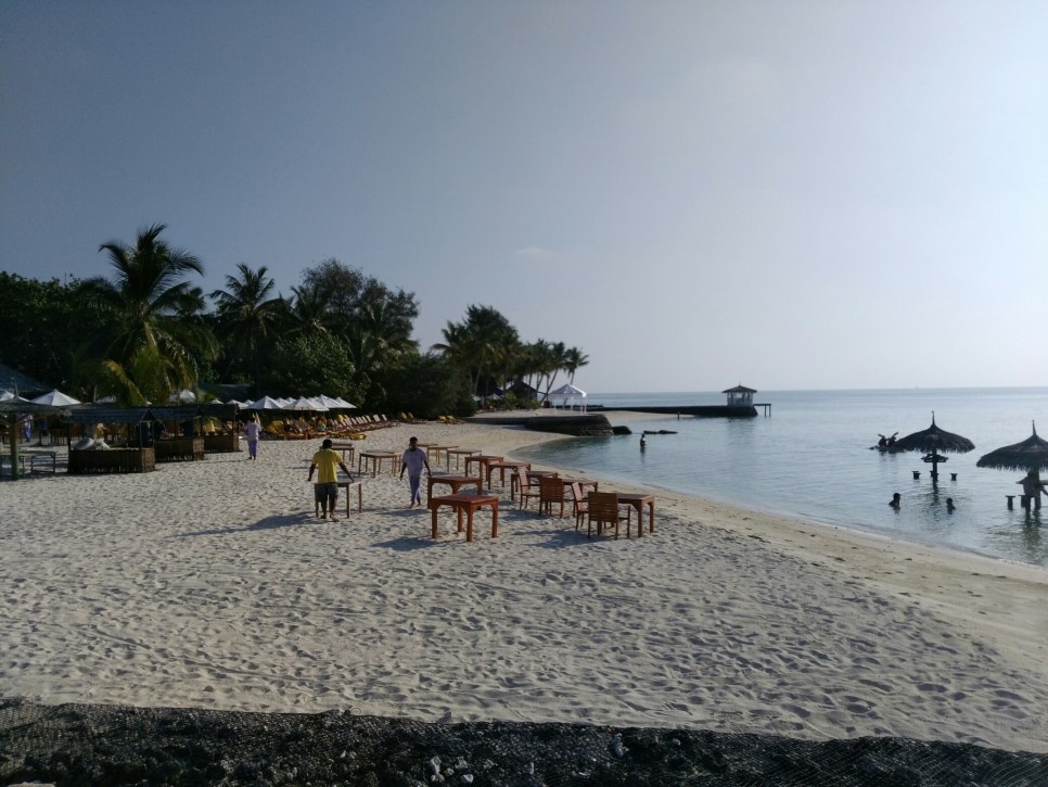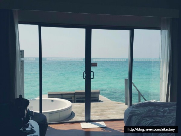 커튼을 치니 등장한 몰디브 바다.