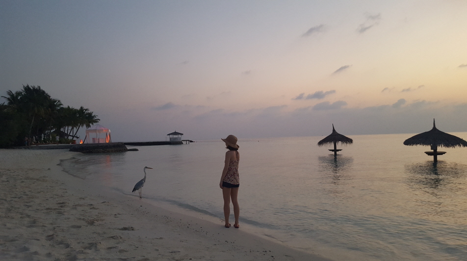 석양이 질 때의 몰디브...간혹 저렇게 큰 새가 보이더라구요. 나무들 사이에서는 조그만 새들이 낮 동안