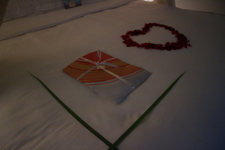 마지막으로 워터빌라로 돌아오니 침대위에 생일선물까지! 예쁜 티셔츠라서 신랑이 남은 일정동안 잘 입었어요.