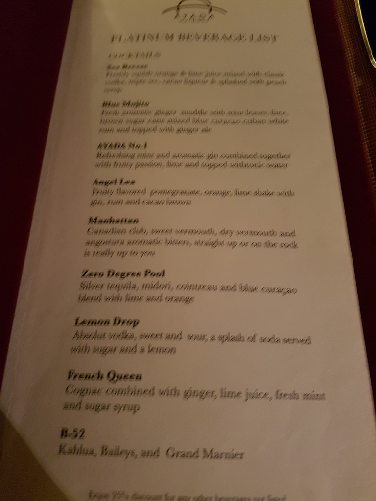 올인클루시브로 갔었고 , 아야다 내에서는 플래티넘 클럽이라고 하여 해당되는 음료, 술 등을 무한대로 먹을 수 있습니다. 저곳에 나와있는 칵테일은 종류별로 2번 이상씩 먹었던 것 같습니다. 뒷페이지에 나오는 와인이나 각종 술, 목테일, 주스, 커피등등도 많이 먹었습니다. (단 미니바는 해당되지 않습니다.) 음식도 아침,점심, 저녁 정말 어마어마하게 많이 먹었습니다. (아침, 저녁은 마구레스토랑에서 부페식으로, 점심은 오션브리즈나 제로디그리에서 거의 코스수준으로 음식 4~5종류씩 시켜먹었습니다.) 사람들이 입에 안맞다는 말을 듣고 갔는데 전혀 .. 너무 맛있게 많이 잘 먹었습니다. 또가서 먹고 싶습니다.ㅠㅠ