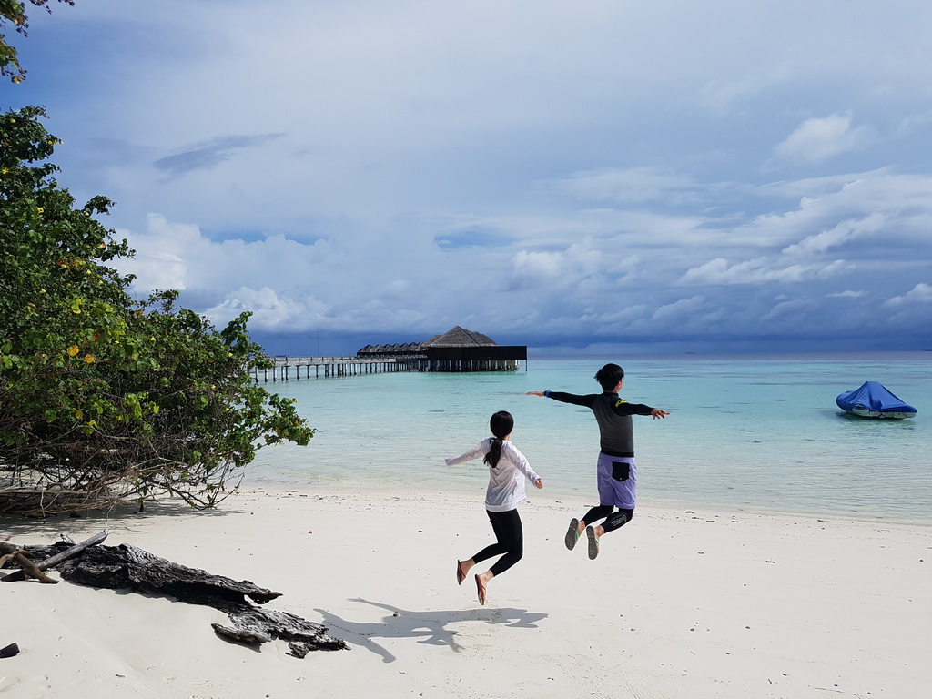 삼각대설치하고 리모콘으로 수십번 눌러서 찍은 점프샷 사진입니다(현재 저희 플필사진입니다.ㅎㅎ) 너무 멋지지 않나요? 몰디브는 날씨도 너무 좋고 놀기도 너무 좋고 정말 완벽한 휴양지 그 자체였습니다.