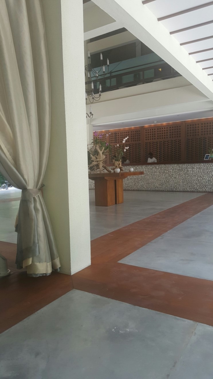 보트에서 내리면 각 팀당 한명씩 직원이 저희를 리셉션까지 인도해줘요~ 각종 액티비티부터 리조트내 시설을 소개해주고 원하는게 있으면 예약도 바로 해주더라구요 로비에서 시원하고 맛있는 코코아 워터랑 예쁜 바니꽃도 선물받았네요~ 그리고 버기를 타고 저희가 묶게될 워터빌라까지 직접 안내해주셨어요