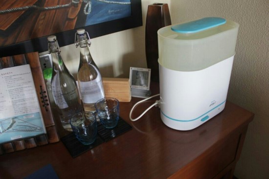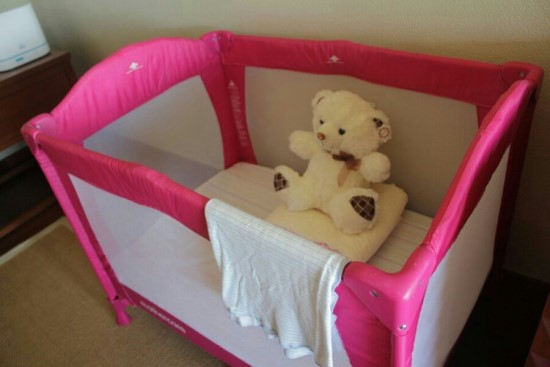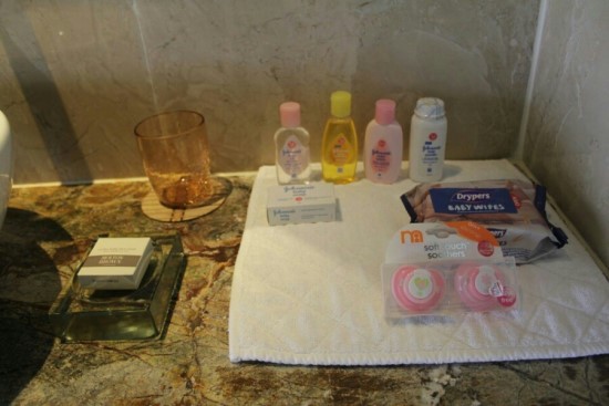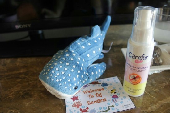 아기를 위해 화장실엔 존슨즈제품 어메니티와 물티슈, 노리개젖꼭지, 곰돌이 인형이 놓인 아기침대와 젖병소독기까지! 아기용 모기퇴치제와 알록달록 웰컴카드가 미니 고래상어 인형과 함께 놓여져 있었어요. 역시 타지는 좋은 곳이야! 감동 좀 받고ㅠㅠ