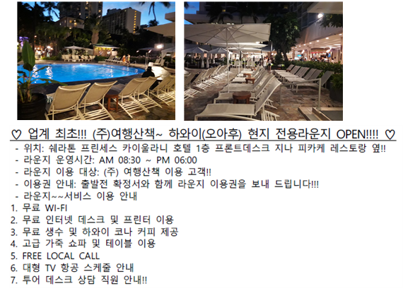 다른 여행사는 진에어, 하와이안으로 90대를 말했는데, 여행산책은 대한항공이랍니다^^