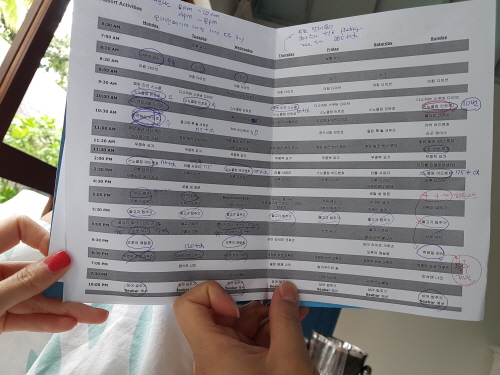 체크인할 때 주는 이런 한글로 된 시간표를 그냥 버리지 마시고 한 번 읽어보시면 좋을 것 같아요.