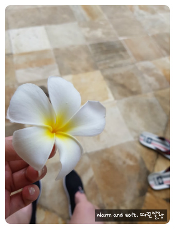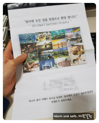 이런 멋진 남자 듀이를 만나 우리는 꾸따 시내로 이동하게 되었다. 공항에서 참 기분 좋았던 것이 프란지파니라는 발리의 꽃으로 된 목걸이를 선물받은 것인데, 아가씨들이 환영의 의미로 관광객들에게 주는 것이다. 첫 발리 여행에 혹시라도 돈을 내고 이용하는건가 섣불리 걱정했던 것과는 달리 말그대로 선물의 의미로 받아 더욱 행복했다. 공항에서 이동하는 동안 우리는 발리 여행 일정이 담긴 책자도 받을 수 있었는데, 일정표와 함께 우리가 결혼준비를 하느라 미리 알아보지 못했던 발리의 문화, 언어, 유의사항 등이 적혀 있어 더욱 즐겁게 여행을 다닐 수 있었다.