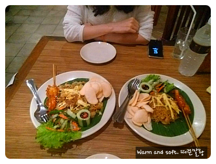 첫 식사는 꾸따에 있는 발레 우당 레스토랑! 발리의 전통어린 건물과 예쁜 조명, 연못이 아름다운, 첫 식사를 낭만 가득하게 먹을 수 있기에 매우 적절한 곳이었다. 메뉴도 나시고랭과 미고랭. 전통적인 인도네시아 식사였는데, 향신료를 많이 못 먹는 편이라 걱정 가득했던 내 입맛에도 정말 맛이 있는, 그런 최고의 발리 첫 식사였다. 고랭이 볶다라는 뜻이 있고, 나시가 밥, 미가 면의 의미가 있어 볶음밥, 볶음면을 먹은 건데, 발리 맥도날드에도 비치할 정도로 전 국민의 소스라 불리우는 우리나라의 고추장 격인 삼발 소스가 들어가 더욱 달콤매콤한 맛으로 먹을 수 있었다.