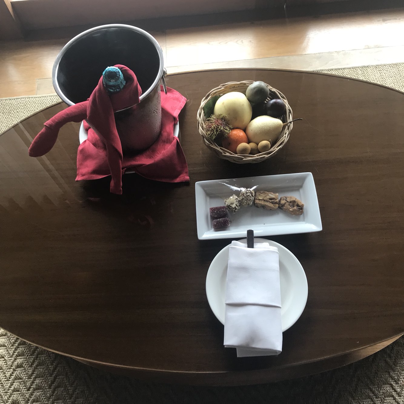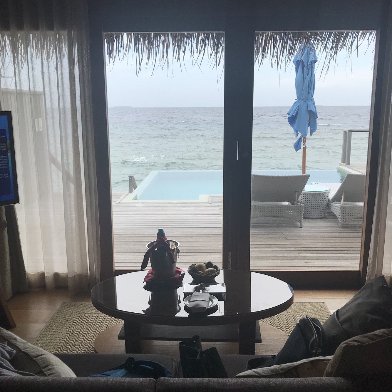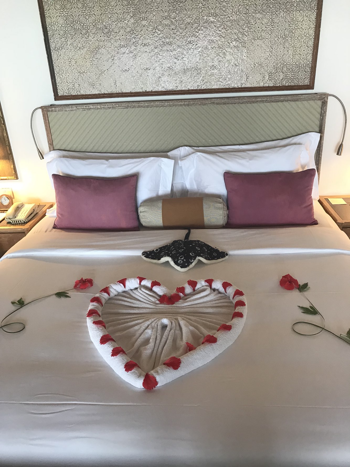 드디어 도착한 오션빌라-! 허니문이여서 예쁜 침대 데코와 샴페인, 그리고 과일과 쿠키, 초콜렛이 놓여져 있었어요.