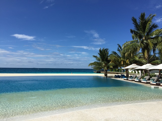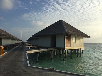 저희는 숙소로 워터방갈로위드풀을 선택했습니다. 개인풀장이 있고 계단 통해 바로 바닷속으로 들어갈 수 있어요. 단점으로는 개인풀은 물이 차가워서 추웠고 바다 환경은 숙소 방향에 따라 달라서 저희쪽은 들어가기 조금 무서운 느낌이었어요. 그래도 탁트인 바다를 침대에 누워서도 볼수 있어서 좋았습니다. 숙소에 들어가니 결혼 축하 메시지와 샴페인이 준비 되어있었습니다. 탁트인 몰디브 바다를 보며 샴페인 한잔을 하니 허니문에 왔다는 사실이 실감이 나더라구요.