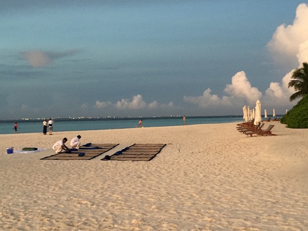 몰디브에서의 시간은 한국보다 3배는 빨리가는 것 같아요. 어느덧 떠나기 전날 오후가 되어 해가 지는걸 보면서 해변을 걷는데 마침 예약이 다차서 대기리스트에 걸어놓았던 요가수업이 비었어요. 요가를 하면서 노을지는 하늘을 보니 많이 아쉽더라구요.