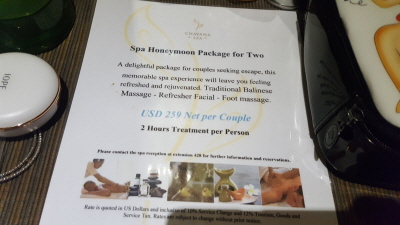신혼여행 출발하기 전부터 수고한 우리에게 마사지 선물을 하자며 비싸도 마사지는 몇번 받을려고 마음먹고 갔는데....... 결론부터 말씀드리면 마사지는 비추에요. 제가 받은 마사지는 허니문 패키지로 2인에 2시간 259불이였어요. 여기에 세금, 봉사료 22%는 별도구요. 금액은 금액이지만 안시원했어요. 지금까지 받아본 마사지 중 가장 별로 였어요. 동네에서 받던 5만원짜리 타이 마사지보다 별로 였네요. 중간에 팩붙이는 10분에서 15분 정도 동안은 마사지를 하지 않으면서 마사지사 둘이 수다떨고 머리마사지는 너무 약하고 남편은 마사지하고 나니 오히려 뻐근하다하더하구요. 그리고 오일을 많이 발라서 번들번들 아무튼 저의 개인적인 견해로 마사지는 비추합니다. 한국오셔서 동네에 타이 마사지 가시는게 나으실거에요.