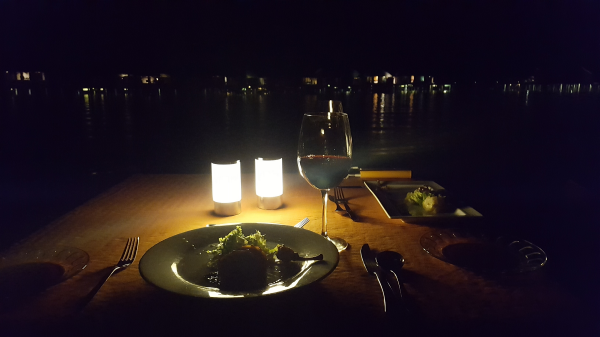 허니문 특전으로 스파클링 와인과 스페셜 디너를 선택할 수 있는데 스파클링 와인은 방 한쪽에 첫날에 있었구요. 스페셜 디너는 버틀러를 통해 예약하면 이용할 수 있어요. 저희는 마지막 전날 저녁을 신청해서 이용했어요. 메뉴는 메인 레스토랑 메뉴이고 서빙을 버틀러가 해준다는 부분만 달라요. 다만 바다를 보면서 해변가에서 먹는 식사, 정말 분위기 좋았어요. 하지만 시간이 지날수록 너무 어두워져서 신랑 얼굴도 잘 안보인답니다.