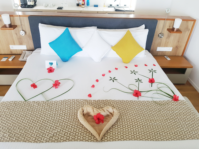 허니문 특전으로 침대장식, 와인한병, 선셋크루즈 를 이용할 수 있었는데