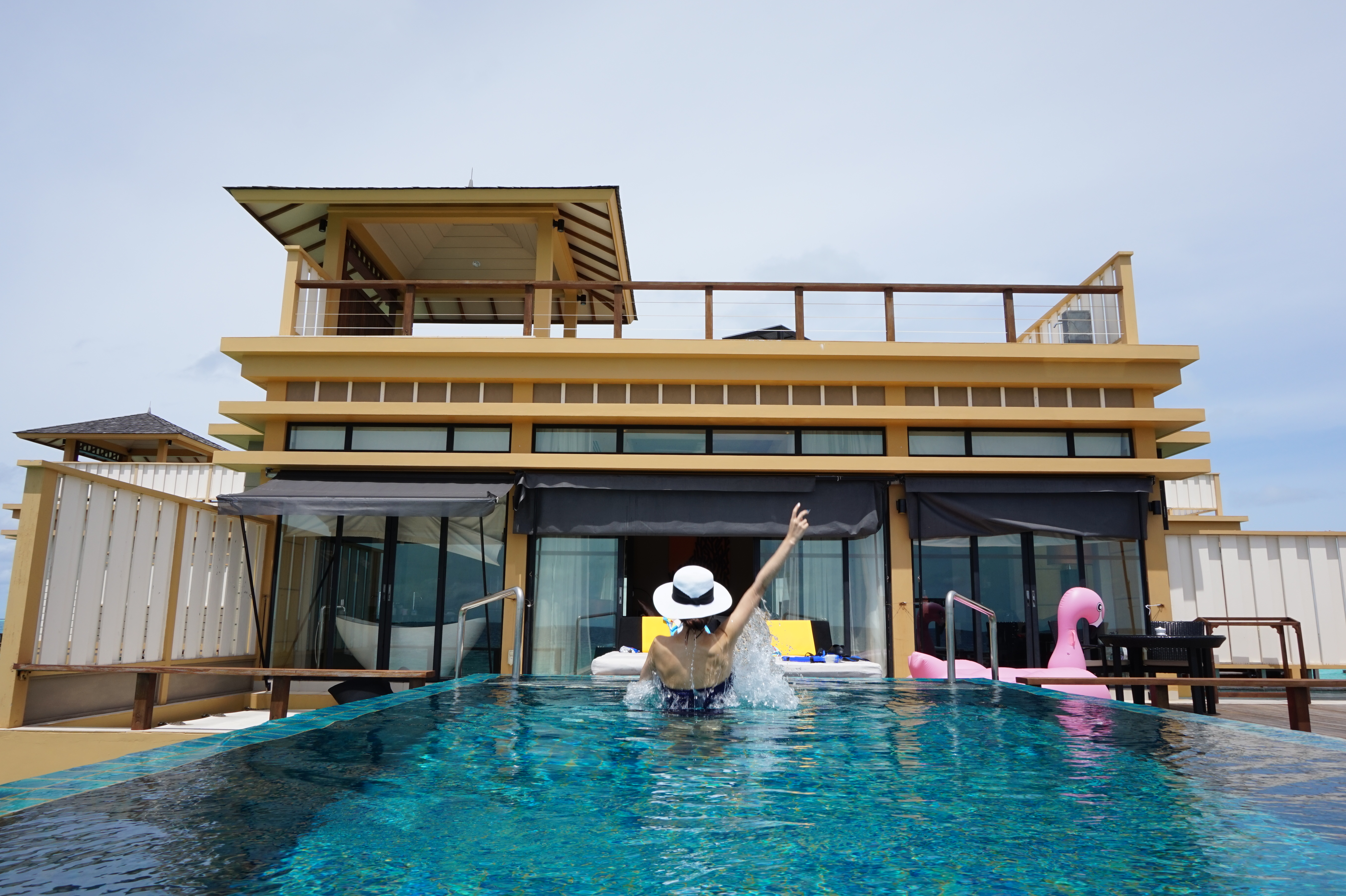 바다에서 바라본 인오션빌라 모습 + 오른쪽에 보이는 플라밍고를 수영장에서 타기에는 위험해서 바다에서 이용하시기를 권고드립니다 :-)