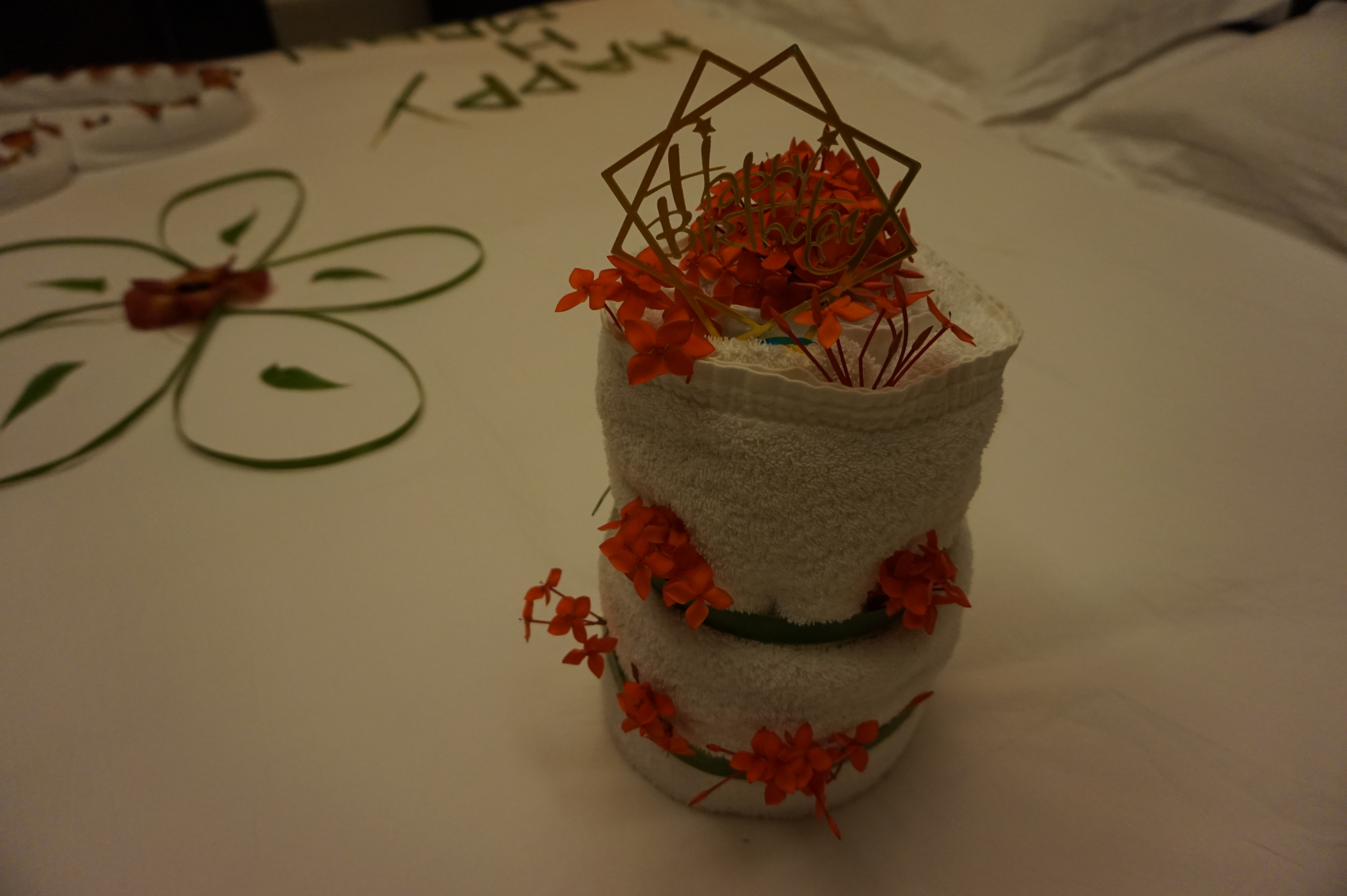 턴다운 서비스 때 허니문 침대데코를 해주셨고 마침 신랑 생일과 겹쳐서 수건으로 만든 생일 케이크(?) ㅋㅋㅋ 도 받았네요. ㅎ_ㅎ
