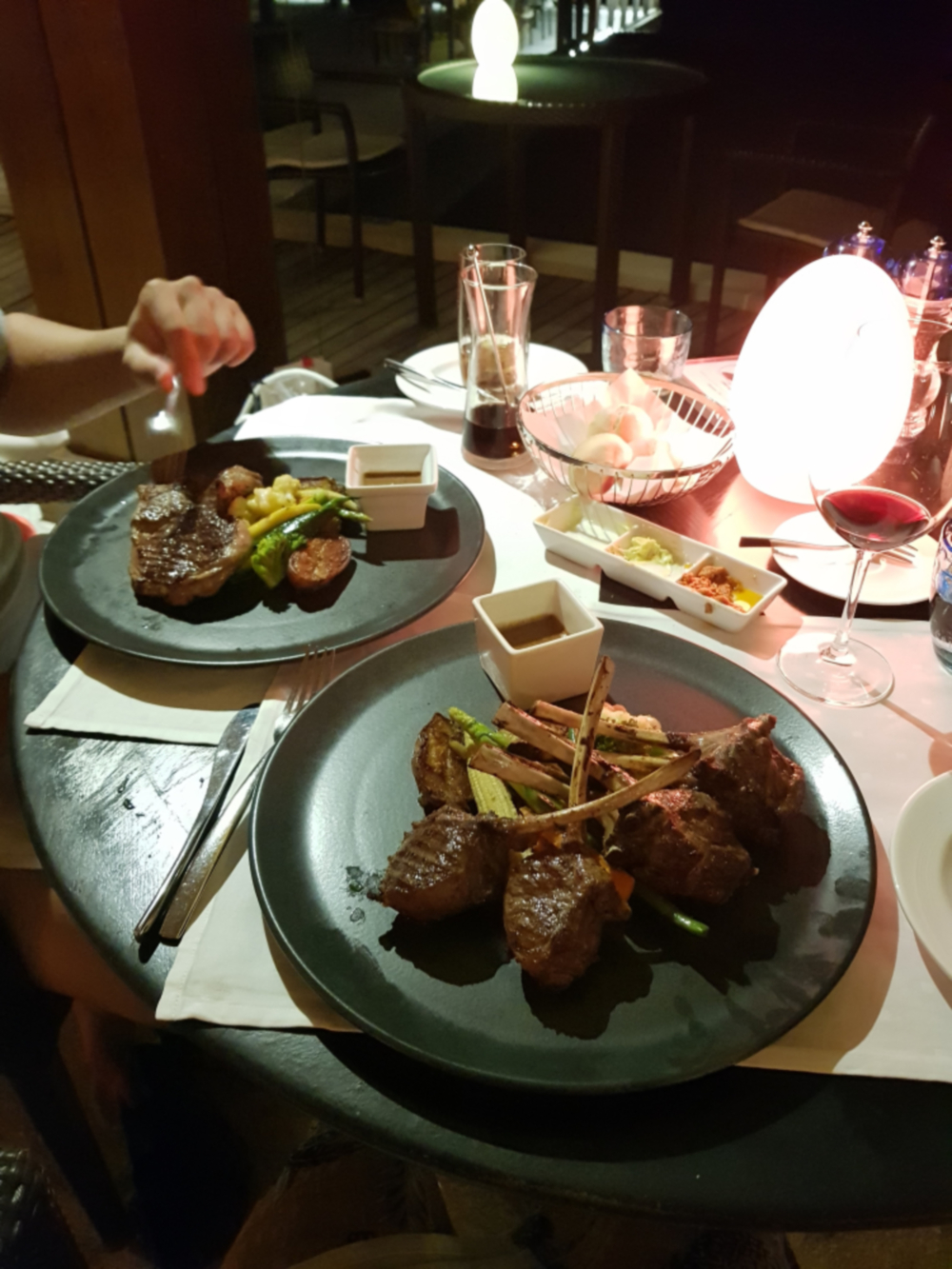 밤에 야외에서 먹으면 음식이 잘 안보여요..ㅋㅋ 램프 더 달라고 해서 키긴 했는데