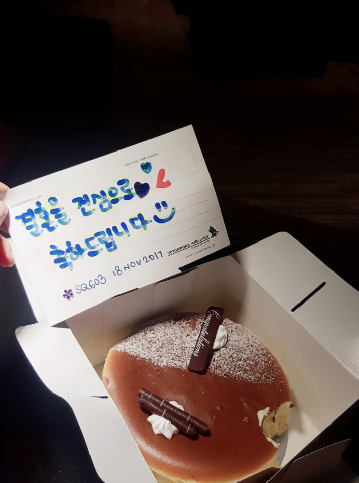 기내식을 먹고 영화를 보고있는데 기념케익이 딱!