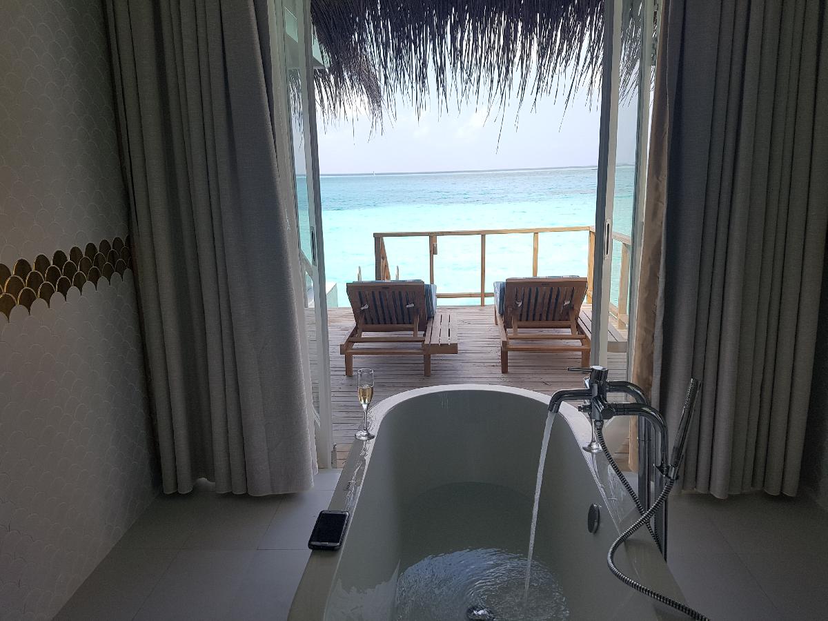욕조에서 바다를 바라보며 샴페인과