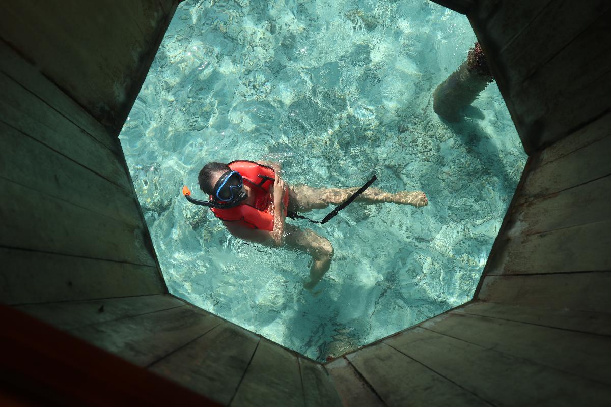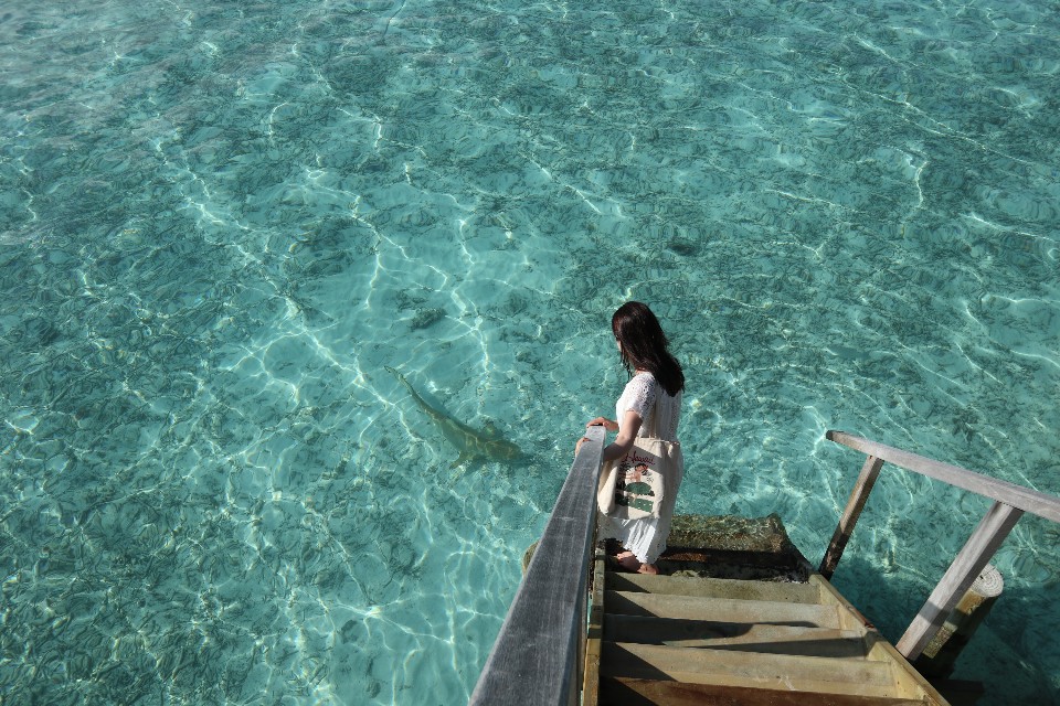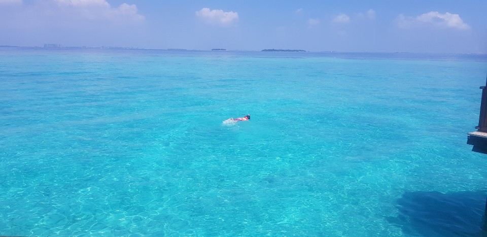 겁많아서 맨날 집앞 워터방갈로에 연결된 계단으로 살짝살짝 바다 나갔었는데 사실 저희집 앞쪽은 백화된 산호여서 스노쿨링하기 최적화된곳은 아닌데 그래도 가끔 떼거지로 너스상어도 자주 왔다갔다하고 간간히 이렇게 물고기 떼들도 열심히 지나갑니다~ 그냥 집에서있으면 생눈으로 막 보여요.
