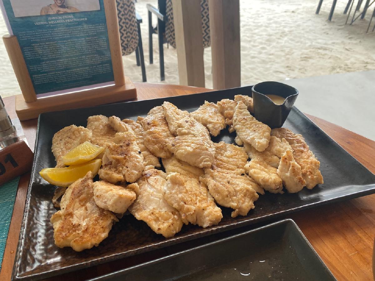 이게 바로 제가 잡은 물고기를 반은 pan fried 그리고 반은 grilled로 요청해서 다음날 점심으로 나온 사진이에요.