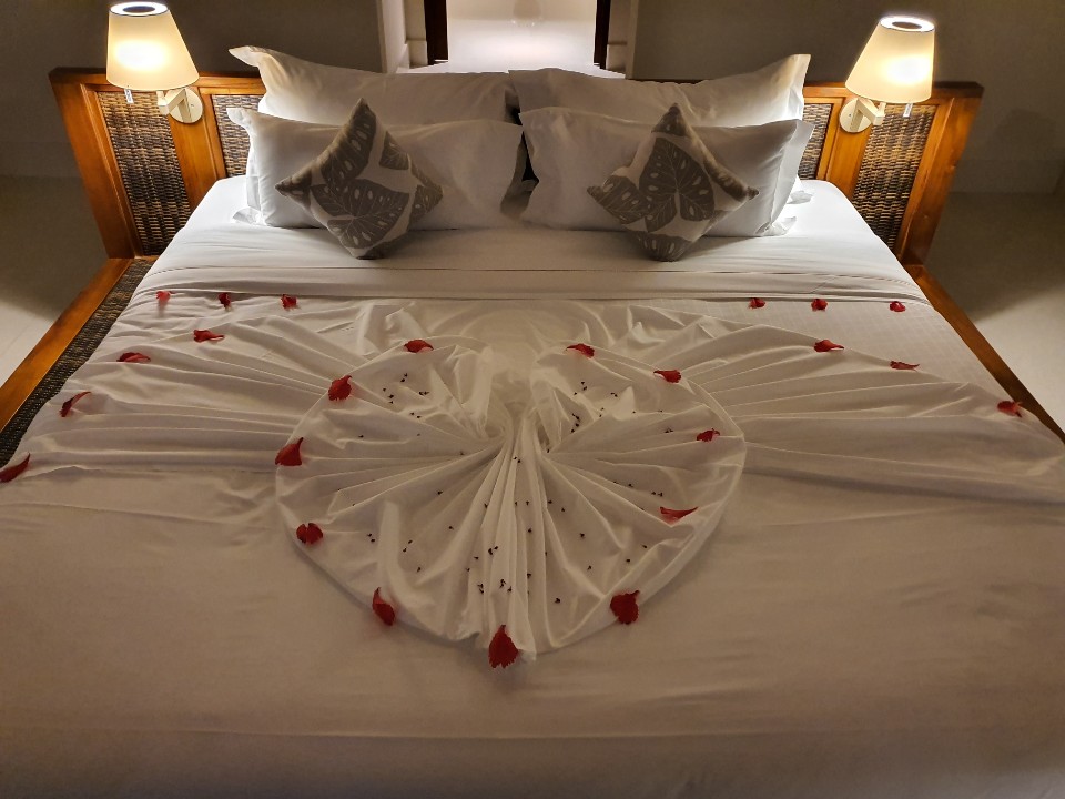 워터빌라였고, 도착하니 꽃잎 하트 베드가 이쁘게 꾸며져있었습니다.