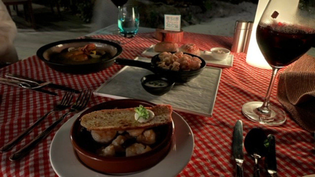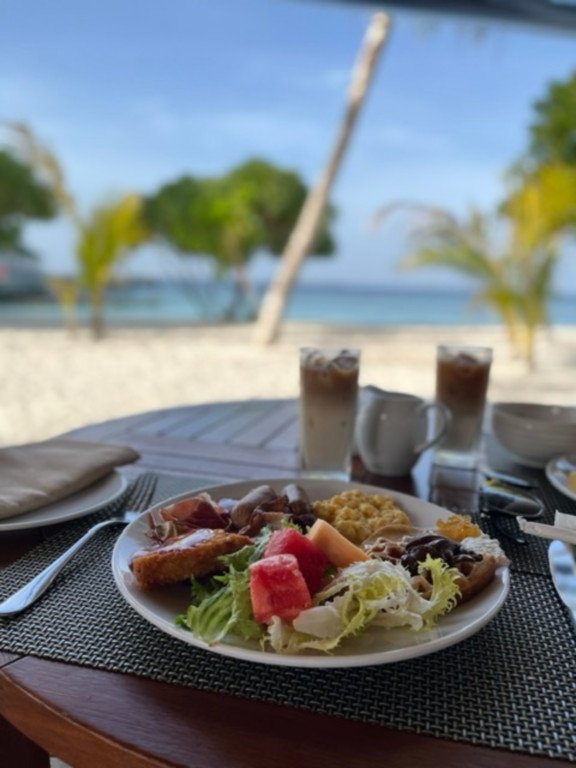 둘째날 아침, 해뜨는 모습을 보면서 선선한 바닷바람을 한껏 느끼고~ 아침을 먹으러 바라바루로 이동했어요. 뷔페식 아침을 먹을 수 있는 곳이에요. 원하는 테이블에 앉앉으면 직원이 와서 음료를 주문받아요. 저희는 아이스라떼 두 잔을 주문하고 음식을 담으러 가서 먹고 싶은 메뉴를 골라 담았어요.