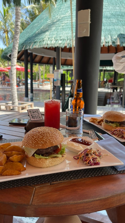 우리는 정글리에서 수영은 패스하고 점심을 먹었어요. 메뉴는 비프 버거, 시저샐러드! 고기가 매우 두툼하고양도 많아서 충분히 배불러요. (간식이 아니고 식사예요) 같이 마신 수박주스도 맛있었어요!