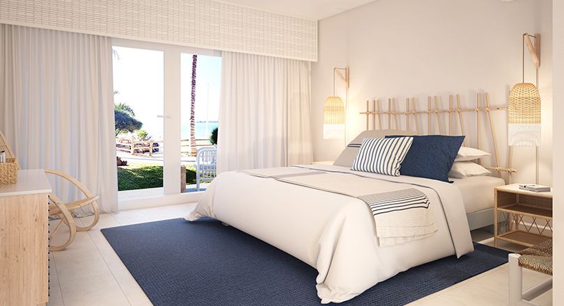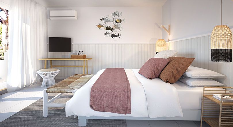다른 침실에서와 같이, 직조 천연 섬유 카펫과 같은 천연 재료의 인테리어가 돋보이는 객실입니다. 외부 수영장에서 몇 번의 헤엄으로 닿을수 있는 객실로 테라스에서 흔들리는 의자에 웅크 리고 있으면 바닷 바람이 당신을 잠들게합니다…. |