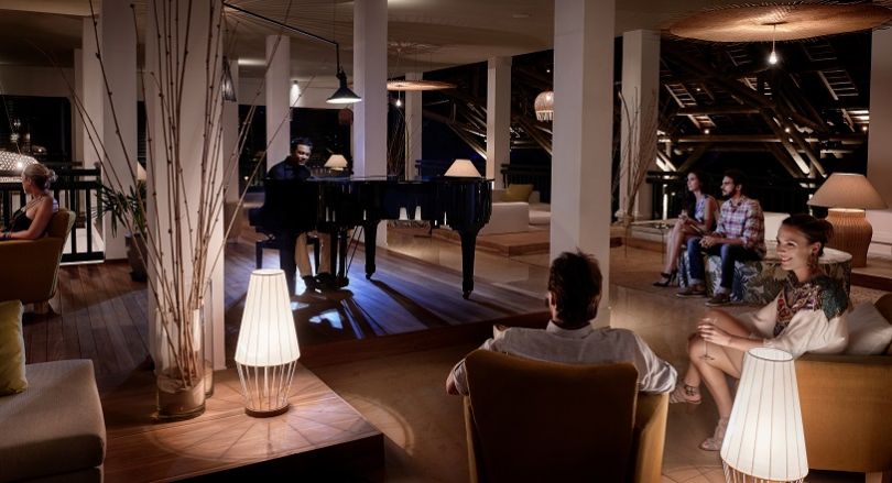 분위기를 바꾸고 싶습니까? 발코니에서 칵테일을 즐기며 피아니스트가 따뜻하고 차분한 저녁 분위기를 조성합니다.. |