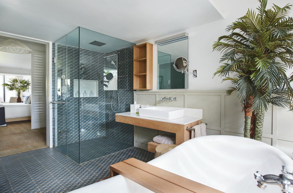 나무 마루, 석호의 전경을 조망할 수 있는 햇볕이 잘 드는 테라스 또는 발코니, Kelly Hoppen의 인테리어 디자인, 복고풍의 세련된 욕실은 슈피리어룸에 아파트나 다락방 같은 느낌을 줍니다. 하지만 비치 하우스 느낌이 있어서 더욱 좋습니다. (욕조없음) |